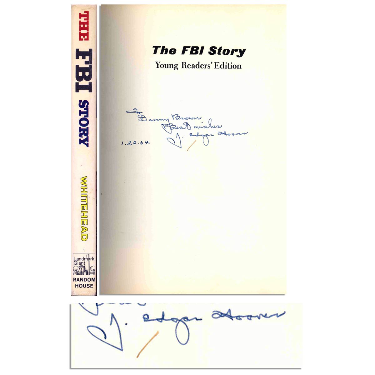 J. Edgar Hoover autographed copy of ''The FBI Story, Young Readers' Edition'' published by Random House: New York: 1963. The FBI Director inscribes the half title page, ''To Danny Brown / Best wishes / J. Edgar Hoover / 1.22.64''. Overall in very good condition with original unclipped dustjacket, also very good.