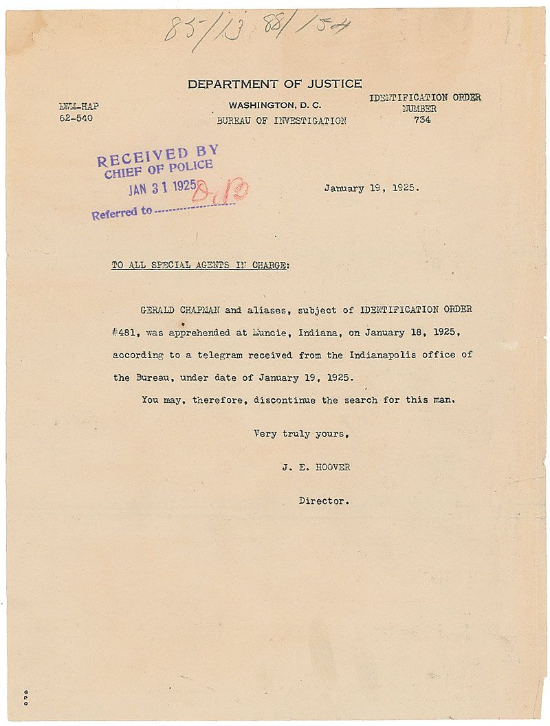 Criminal (1887–1926) who co-led an early Prohibition-era gang with George ‘Dutch’ Anderson. He was known as ‘The Gentleman Bandit,’ and was the first to be called ‘Public Enemy Number One’ by the press. Two typed Department of Justice documents related to Chapman. First includes the information for producing a wanted poster and labels him as a “Fugitive from Justice,” one page, 8 x 10.25, August 16, 1923, and includes a physical description and details of two of his escapes from custody; stapled to the document is a mug shot showing Chapman with and without his glasses. Second was issued by J. Edgar Hoover, one page, 8 x 10.5, January 19, 1925, reporting that Chapman “was apprehended at Muncie, Indiana…therefore, discontinue the search for this man.” Expected document wear, otherwise overall fine condition.