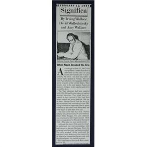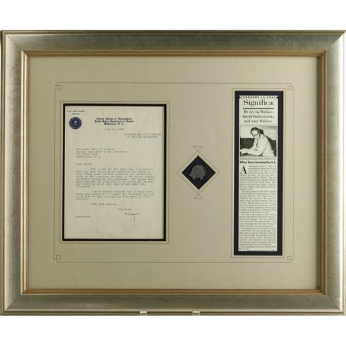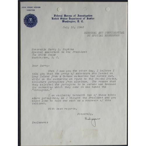 <B>Great War-dated J. Edgar Hoover Letter to FDR Advisor Hopkins</B></I> Discussing the German Saboteur Who Landed on Long Island. Dated July 10, 1942, shortly after the incident. Measuring 6.5" x 9.0", Fine but for two punch holes at top, beautifully custom-framed with an article about the saboteur. TLS, signed "<I> Edgar>Q". In one of the more infamous domestic events of WWII, four German saboteurs landed on Long Island, after disembarking from a U-boat, in a rubber raft (four days earlier a simular group landed in Florida). They were quickly rounded up, and six of the eight were executed. Hoover writes to Hopkins about miniature carved aluminum porcupines which the German had made to pass the time on the voyage over, and he sends two of them, one for Hopkins and one for the President, as souvenirs of the episode (they chose this subject because their submarine was called the Porcupine). Marked "personal and confidential by special messenger". <BR><BR>A Charming letter referring to this famous incident, and relating a little-known sidelight. One of the actual aluminium porcupines is framed between the letter and the article, a delightful little carving.