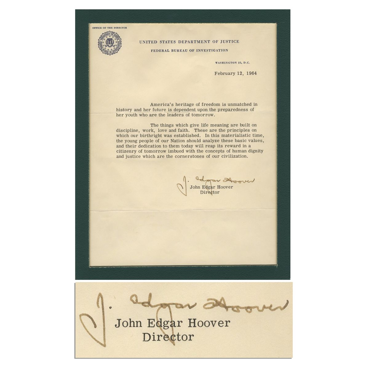 J. Edgar Hoover typed manuscript signed, dated 12 February 1964 on FBI letterhead. In this unaddressed document, Hoover writes of American youth as the ''citizenry of tomorrow''. It reads in part, ''…The things which give life meaning are built on discipline, work, love and faith. These are the principles on which our birthright was established. In this materialistic time, the young people of our Nation should analyze these basic values…'' The 7.75'' x 9.75'' page, matted to an overall size of 8'' x 10'', is in near fine condition.