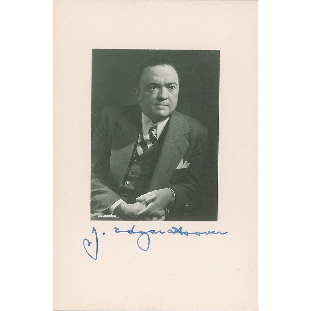 Vintage fountain pen signature, "J. Edgar Hoover,” on an off-white 4 x 6 card bearing an affixed portrait of the famed FBI director. In very fine condition.