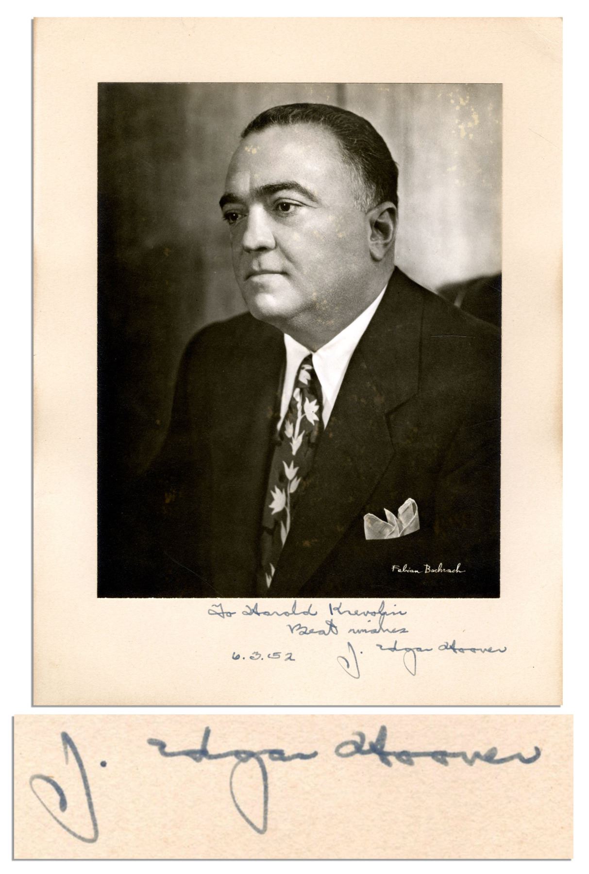 Longtime FBI Director J. Edgar Hoover Signed 6.75'' x 8.5'' Matte Photo -- Matted to 11'' x 9'' Cardstock -- ''To Harold Krevolin / Best wishes / 6.3.52 J. Edgar Hoover'' -- Near Fine
