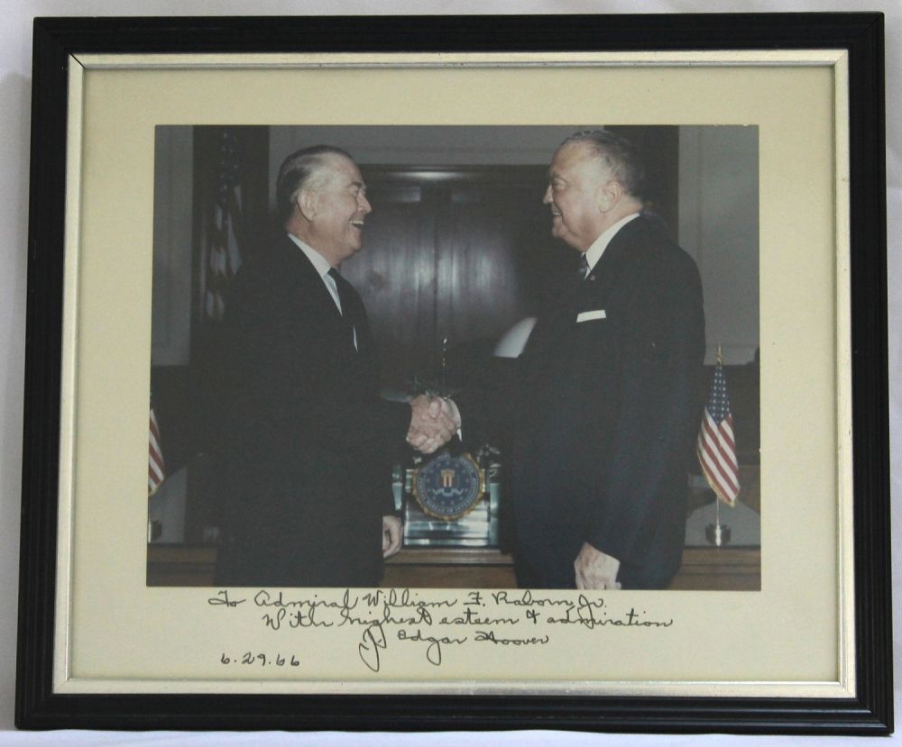Piece measures 12" x 10" in size and is hand-signed by John Edgar Hoover (D 1972). The photo shows Hoover shaking hands with Admiral William F. Raborn and is inscribed to Admiral Raborn and dated 6-29-66.