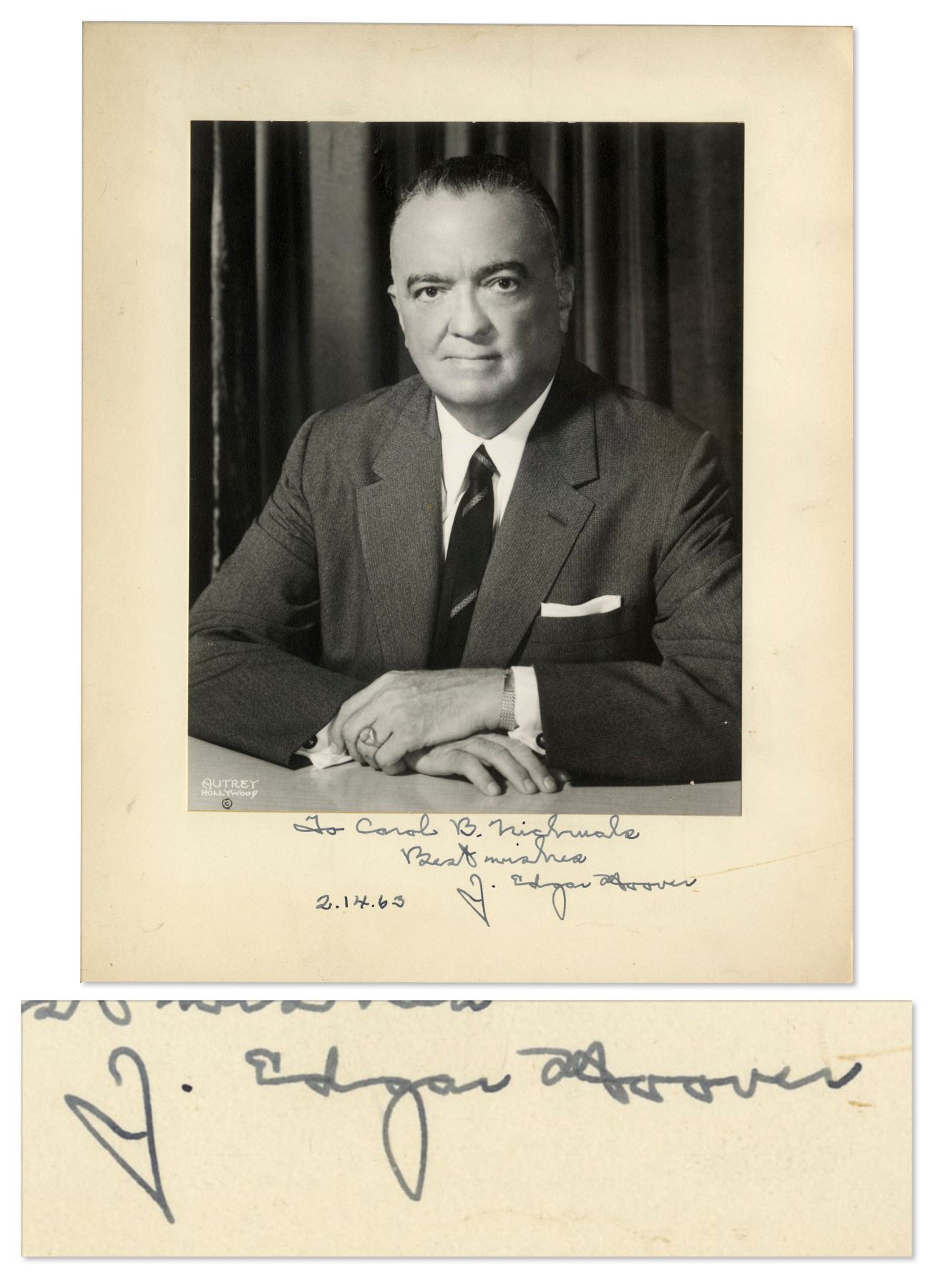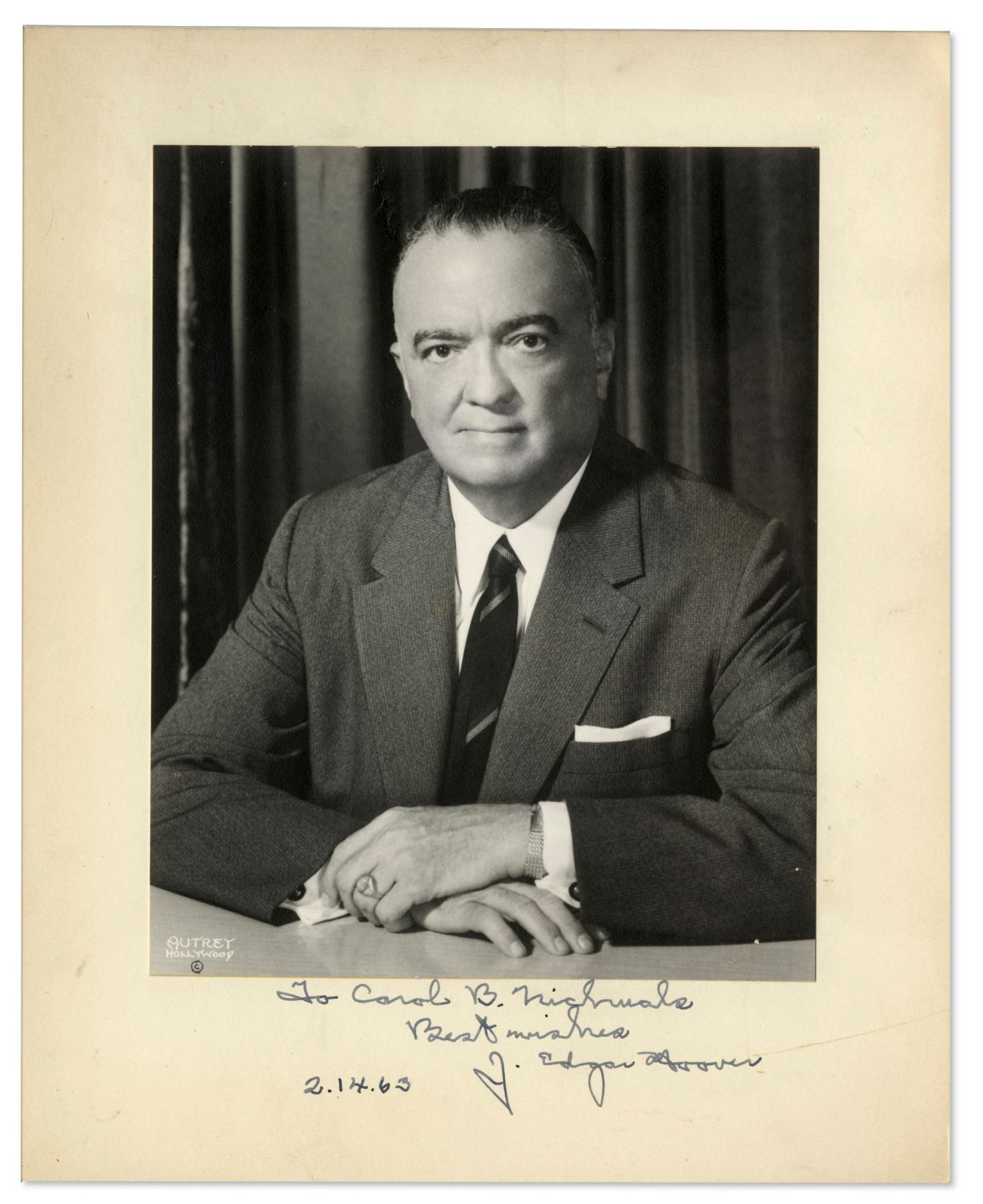 Photo signed by infamous FBI director J. Edgar Hoover. Black and white portrait depicts Hoover in a suit, with ''To Carol B. Nichuals / Best wishes / J. Edgar Hoover / 2.14.63'' inscribed on the mat. Matte photo measures 6.5'' x 8'', mounted to an overall size of 9'' x 11.25''. Some toning. Near fine.