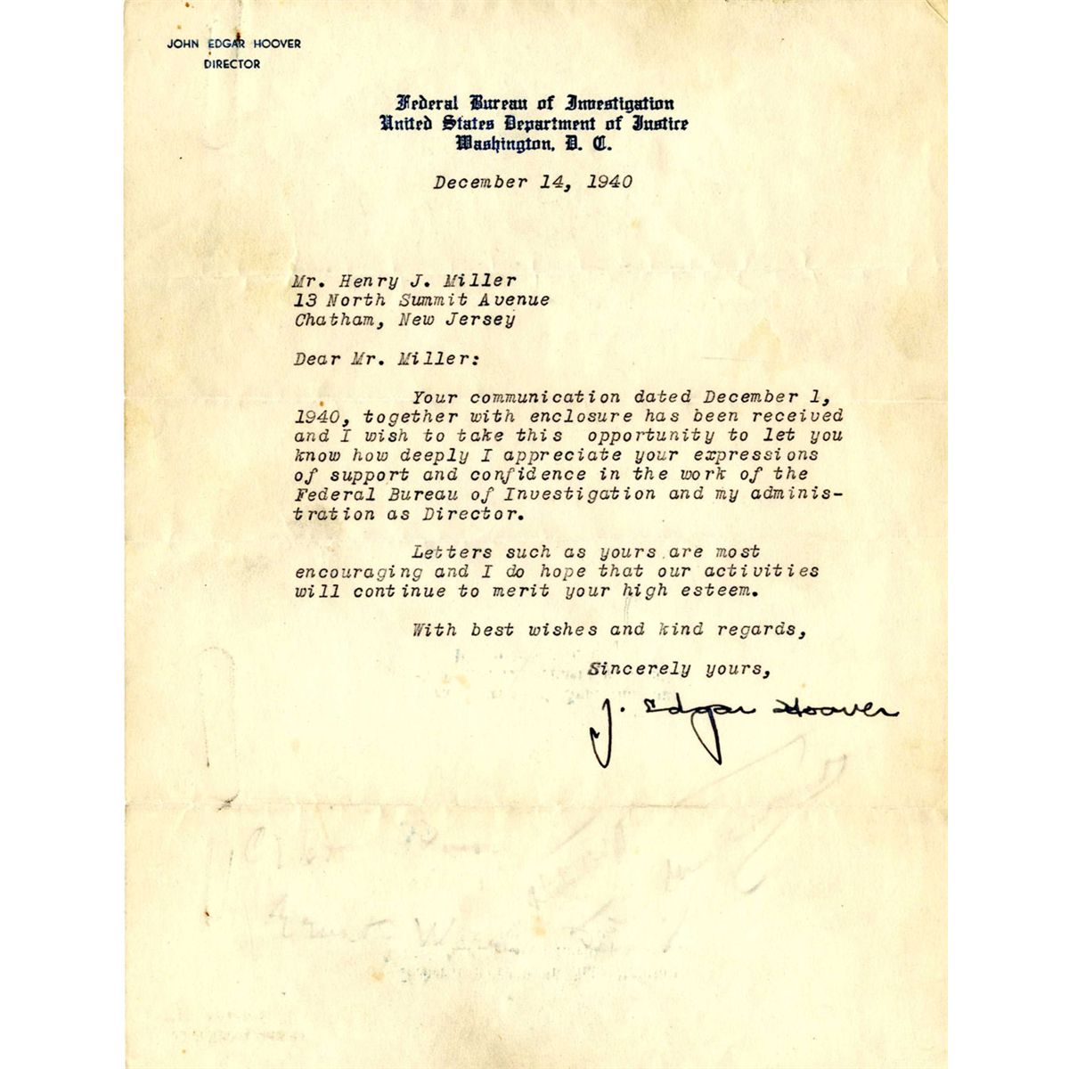 J. Edgar Hoover typed letter signed as FBI Director dated 14 December 1940 on FBI letterhead. Hoover thanks Mr. Henry J. Miller for his ''expressions of support and confidence in the work of the Federal Bureau of Investigation and my administration as Director.'' He signs: ''J. Edgar Hoover''. The 7'' x 9.25'' one sheet letter shows edge wear and moderate soiling. Overall very good condition.