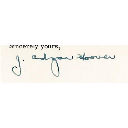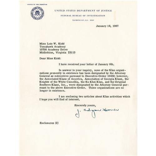 <B>J. Edgar Hoover Typed Letter Signed Regarding the Ku Klux Klan.</B></I> One page, United States Department of Justice FBI letterhead, Washington, D.C., January 16, 1967. An answer to an inquiry from a woman in Virginia, in part: "...In answer to your inquiry, none of the Klan organizations presently in existence has been designated by the Attorney General as subversive pursuant to Executive Order 10450..." He sends this woman two articles about Klan activities (not present). Fine condition; mailing fold, small stain at top above date detracts very little.