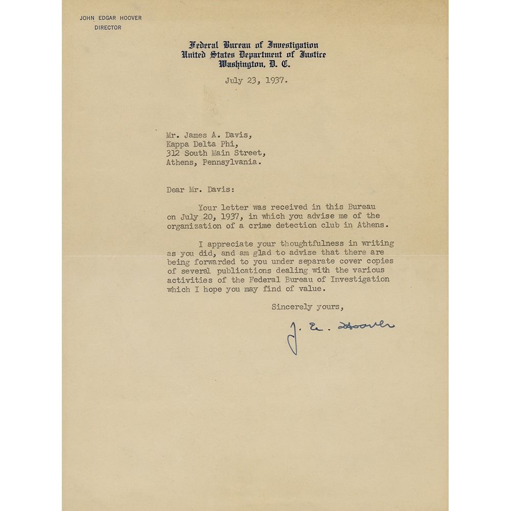 TLS signed “J. E. Hoover,†one page, 7 x 9.5, Federal Bureau of Investigation letterhead, July 23, 1937. Letter to James A. Davis of Athens, Pennsylvania, in part: "Your letter was received in this Bureau on July 20, 1937, in which you advise me of the organization of a crime detection club in Athens. I appreciate your thoughtfulness in writing as you did, and am glad to advise that there are being forwarded to you under separate cover copies of several publications dealing with the various activities of the Federal Bureau of Investigation which I hope you may find of value." In fine condition.