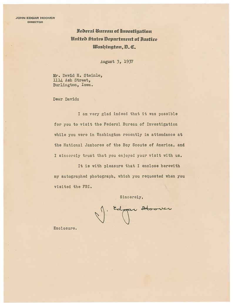 TLS, one page, 8 x 10.5, Federal Bureau of Investigation letterhead, August 3, 1937. Hoover writes David H. Steinle of Burlington, Iowa. In part: “I am very glad indeed that it was possible for you to visit the Federal Bureau of Investigation while you were in Washington recently in attendance at the National Jamoree of the Boy Scouts of America, and I sincerely trust that you enjoyed your visit with us.” In fine condition, with a couple of wrinkles, light uniform toning, and a few spots of soiling. Accompanied by a portrait bearing a facsimile signature.