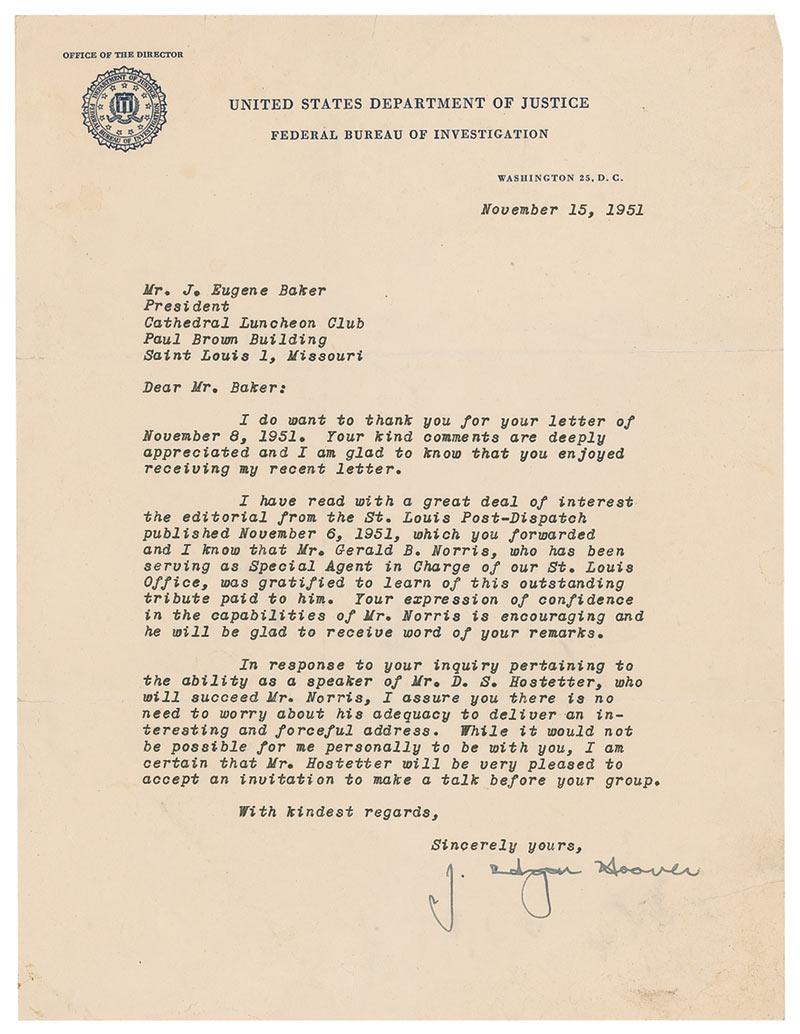 TLS, one page, 8 x 10.5, FBI letterhead, November 15, 1951. Letter to the president of the Cathedral Luncheon Club. In part: “I have read with a great deal of interest the editorial from the St. Louis Post-Dispatch…which you forwarded and I know that Mr. Gerald B. Norris, who has been serving as Special Agent in Charge of our St. Louis Office, was gratified to learn of this outstanding tribute to him. Your expression of confidence in the capabilities of Mr. Norris is encouraging and he will be glad to receive word of your remarks.” In very good condition, with partial separations along horizontal folds, a few small edge tears, scattered creases, and light toning and soiling.