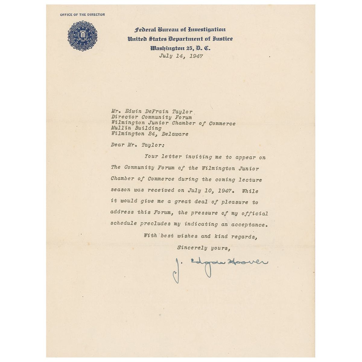 TLS, one page, 8 x 10.5, Federal Bureau of Investigation letterhead, July 14, 1947. Hoover responds to an invitation from Edwin DeFrain Taylor, in full: “Your letter inviting me to appear on The Community Forum of the Wilmington Junior Chamber of Commerce during the coming lecture season was received on July 10, 1947. While it would give me a great deal of pleasure to address this Forum, the pressure of my official schedule precludes my indicating an acceptance.” In fine condition, with a few light creases.