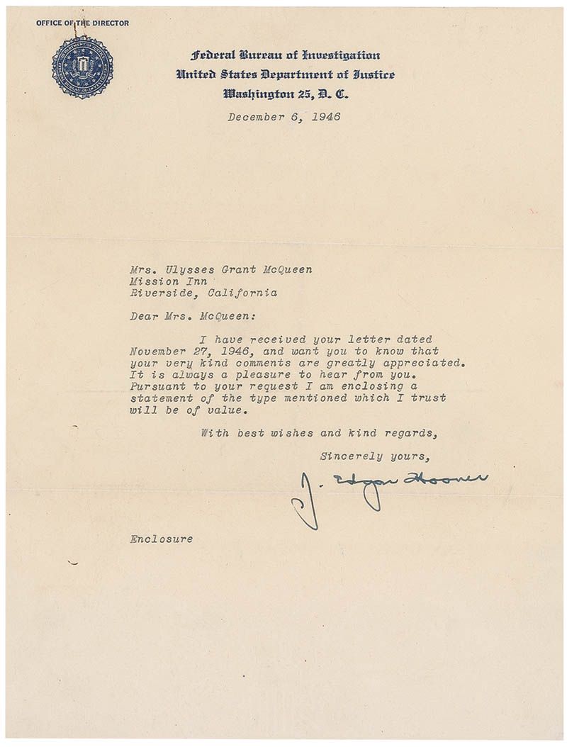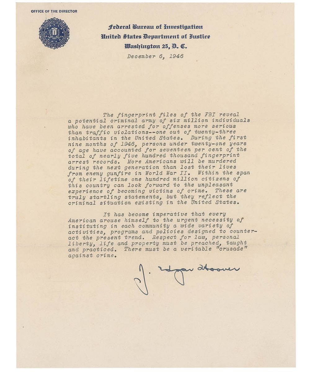 Typed statement, one page, 8 x 10.5, FBI letterhead, December 6, 1946. Statement regarding widespread crime in the United States. In part: “The fingerprint files of the FBI reveal a potential criminal army of six million individuals who have been arrested for offenses more serious than traffic violations—one out of twenty-three inhabitants in the United States…More Americans will be murdered during the next generation than lost their lives from enemy gunfire in World War II. Within the span of their lifetime one hundred million citizens of this country can look forward to the unpleasant experience of becoming victims of crime…Respect for law, personal liberty, life and property must be preached, taught and practiced. There must be a veritable ‘crusade’ against crime.” Included is a TLS to Mrs. Ulysses Grant McQueen, a transmittal letter for the statement, also signed by Hoover. Intersecting folds, the vertical fold passing through a single letter of the signature, a paperclip impression to the top, and mild scattered creases and soiling, otherwise fine condition. Accompanied by the original mailing envelope. Hoover oversaw the expansion and centralization of fingerprint files, leading the New York Times to call the FBI a ‘world clearing house for identifying criminals.’