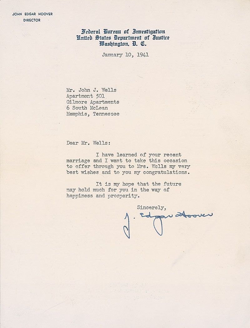 TLS, one page, 7 x 9.25, Federal Bureau of Investigation letterhead, January 10, 1941. Letter to a John J. Wells of Memphis. In part: “I have learned of your recent marriage and I want to take this occasion to offer through you to Mrs. Wells my very best wishes and to you my congratulations.” In fine condition.