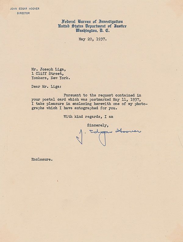 Vintage matte-finish 9 x 11.5 portrait, signed and inscribed in the lower border in fountain pen, “To Joseph Liga, Sincerely, J. Edgar Hoover, 5/20/37.” Also included is a TLS, one page, 7 x 9.25, FBI letterhead, May 20, 1937, transmitting the signed photo. In overall fine condition, with light silvering to dark areas of the image.
