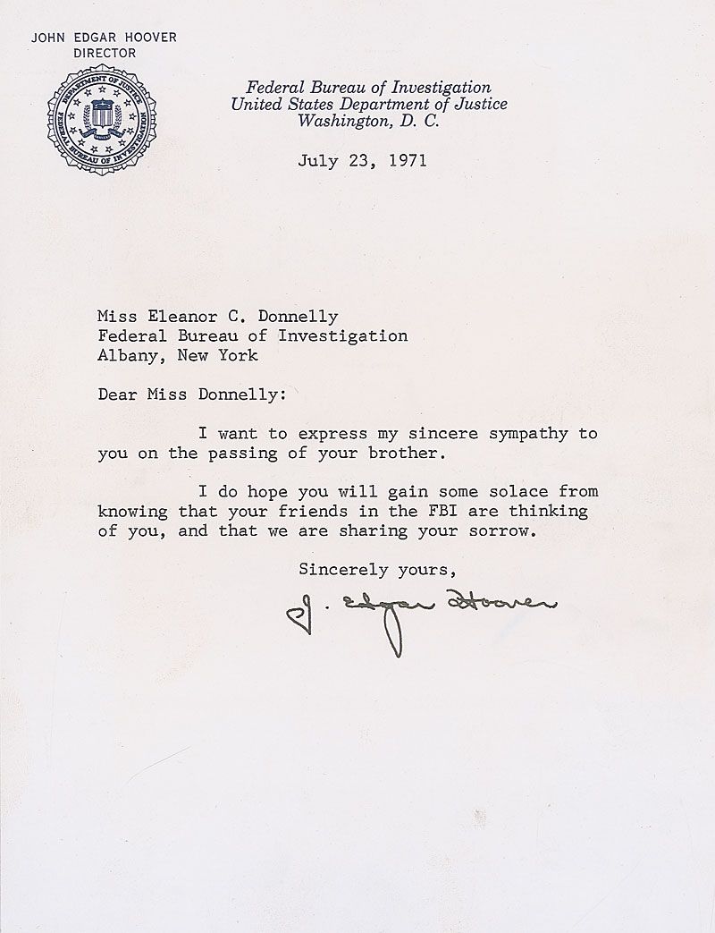 TLS, one page, 7 x 9.25, FBI letterhead, July 23, 1971. Brief letter of condolences. In full: “I want to express my sincere sympathy to you on the passing of your brother. I do hope you will gain some solace from knowing that your friends in the FBI are thinking of you, and that we are sharing your sorrow.” In fine condition. Accompanied by the original mailing envelope.