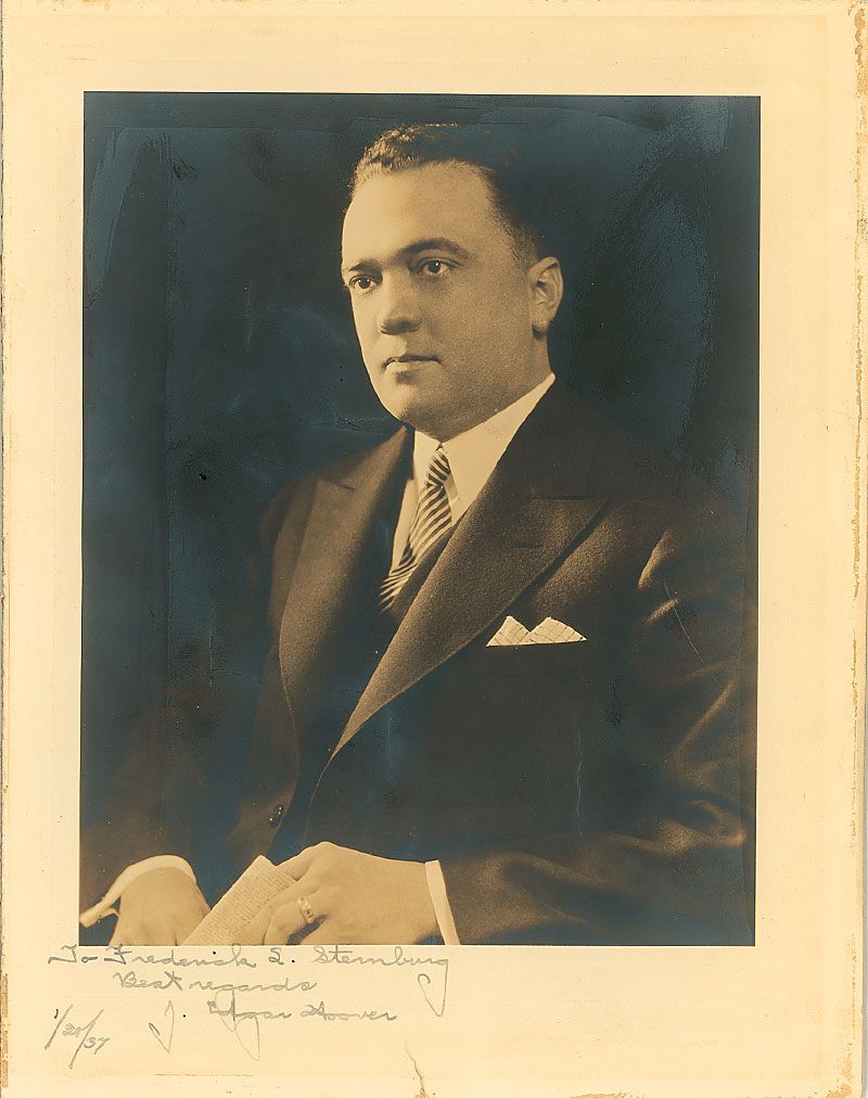 Vintage matte-finish 8.75 x 11.25 photo, signed and inscribed, “To Frederick L. Sternburg, Best regards, J. Edgar Hoover, 1/30/37.” In very good condition, with creasing and mounting remnants to edges and light overall silvering to background of image.