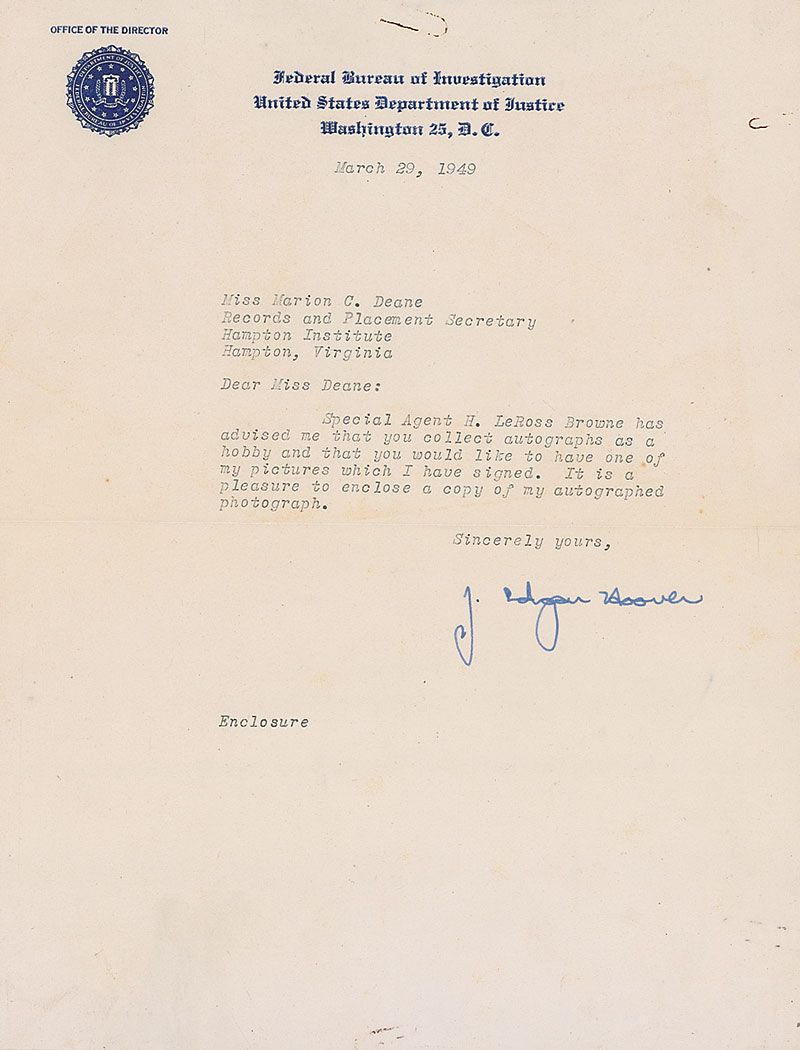 Two items: TLS, one page, 8 x 10.25, FBI letterhead, March 29, 1949. Short letter to a collector reads, in part: “Special Agent H. LeRoss Browne has advised me that you collect autographs…and that you would like to have one of my pictures which I have signed. It is a pleasure to enclose a copy of my autographed photograph”; and a matte-finish 4 x 6 photo, signed in the lower border in blue ink. In fine condition, with a paperclip impression to edge of photo, and a few rusty paperclip marks to edges of letter.