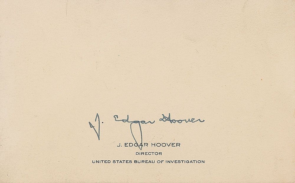 Vintage fountain pen signature, “J. Edgar Hoover,” on an off-white 5.25 x 3.25 personal stationery card. In fine condition.