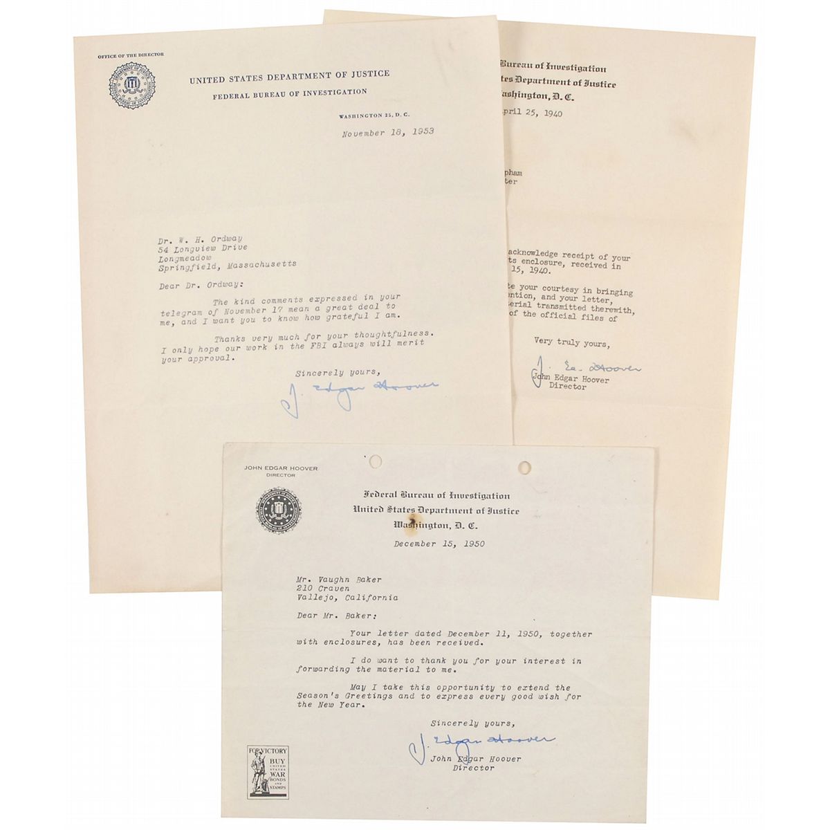 Three TLSs, all signed, “J. Edgar Hoover,” all one page, various sizes, all on FBI letterhead, dated from 1940–1953, with Hoover sending polite thanks for sent materials or comments. In fine condition, with punch holes and light toning to one of the letters.