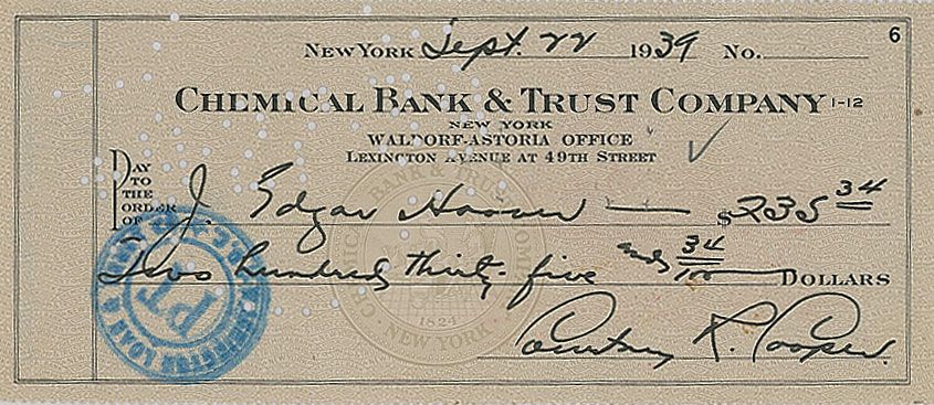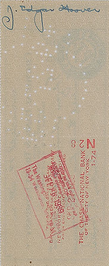 Bank check, 6.25 x 2.75, filled out and signed by Courtney R. Cooper, payable to J. Edgar Hoover for $235.34, September 22, 1939, and endorsed on the reverse by Hoover, “J. Edgar Hoover.” In fine condition, with a central vertical fold and expected bank stamps and cancellation holes. Courtney Ryley Cooper was a writer who published over 30 books, including many on the topic of crime—Hoover greatly admired Cooper, calling him ‘the best informed man on crime in the US.’ It is also thought that Cooper served as a ghostwriter for some of Hoover’s publications, including magazine articles and the 1938 book Persons in Hiding. This is the first time we have ever offered a Hoover check in any form.