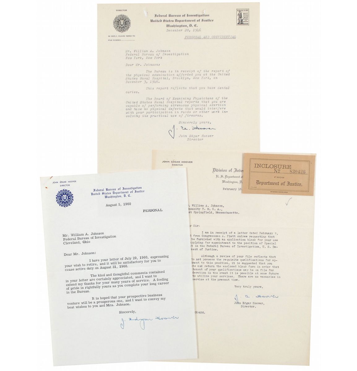 Three TLSs to William A. Johnson, an FBI agent: first is signed “J. E. Hoover,” one page, Department of Justice letterhead, February 15, 1935, in response to an inquiry about “applying for an appointment to the position of Special Agent in the Federal Bureau of Investigation…Although a review of your file reflects that you do not possess the requisite qualifications”; second is signed “J. E. Hoover,” one page, 8 x 10.5, FBI letterhead, December 20, 1946, regarding the receipt of an exam report that states he is “capable of performing strenuous physical exertion and have no physical defects that would interfere with your participation in raids or other work involving the practical use of firearms”; and a third signed “J. Edgar Hoover,” one page, 7.25 x 9.5, FBI letterhead, August 5, 1960, approving Johnson’s request to retire with the suggestion that “it will be satisfactory for you to cease active duty on August 31.” In overall fine condition.