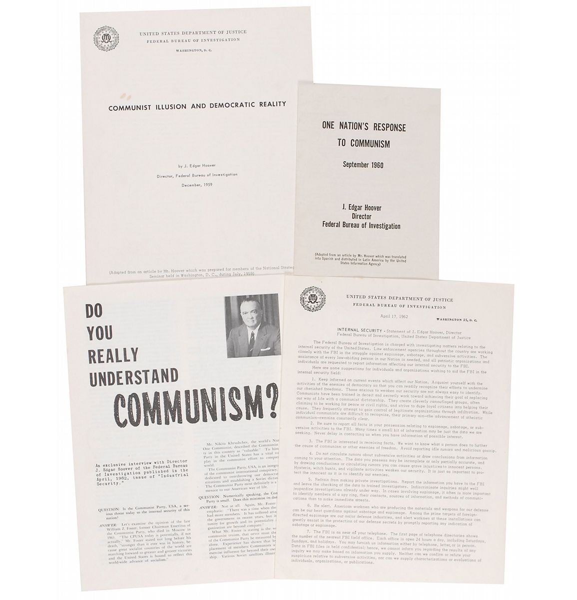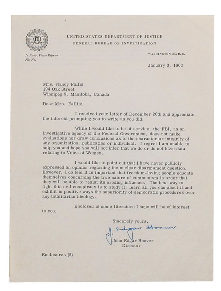 TLS, one page, 8 x 10.5, FBI letterhead, January 3, 1963. Letter reads, in part: “While I would like to be of service, the FBI, as an investigative agency of the Federal Government, does not make evaluations nor draw conclusions as to the character or integrity of any organization, publication or individual. I regret I am unable to help you and hope you will not infer that we do or do not have data relating to Voice of Women. I would like to point out that I have never publicly expressed an opinion regarding the nuclear disarmament question. However, I do feel it is important that freedom-loving people educate themselves concerning the true nature of communism in order that they will be able to resist its eroding influence…Enclosed is some literature I hope will be of interest to you.” In fine condition, with some scattered light creases. Accompanied by four pieces of literature enclosed with the letter, all dealing with communism.