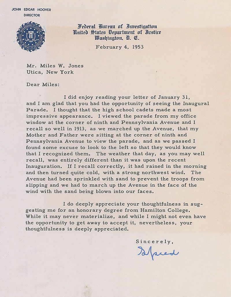 TLS signed “Speed,” one page, 7 x 9, FBI letterhead, February 4, 1953. Letter to Miles Jones. In part: “I am glad that you had the opportunity of seeing the Inaugural Parade. I thought that the high school cadets made a most impressive appearance. I viewed the parade from my office window at the corner of Ninth and Pennsylvania Avenue and I recall so well in 1913, as we marched up the Avenue, that my Mother and Father were sitting at the corner of Ninth and Pennsylvania Avenue to view the parade, and as we passed I found some excuse to look to the left so that they would know that I recognized them. The weather that day, as you may well recall, was entirely different than it was upon the recent Inauguration. If I recall correctly, it had rained in the morning and then turned quite cold, with a strong northwest wind. The Avenue had been sprinkled with sand to prevent the troops from slipping and we had to march up the Avenue in the face of the wind with the sand being blown into our faces.” In fine condition, with marginal binding holes to left edge.