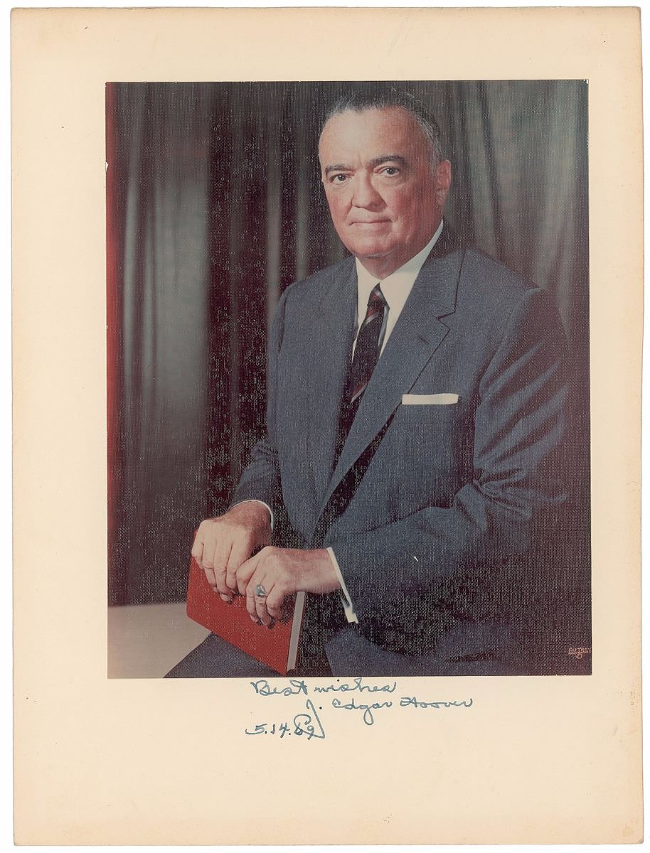 Color textured semi-glossy 6.5 x 8 photo of Hoover by Autrey of Hollywood, affixed to its original 8.25 x 11.25 mount, signed on the mount in fountain pen, “Best wishes, J. Edgar Hoover, 5.14.69.” In fine condition, with a few dings to edges of photo, and trivial soiling and a trimmed right edge to the mount.