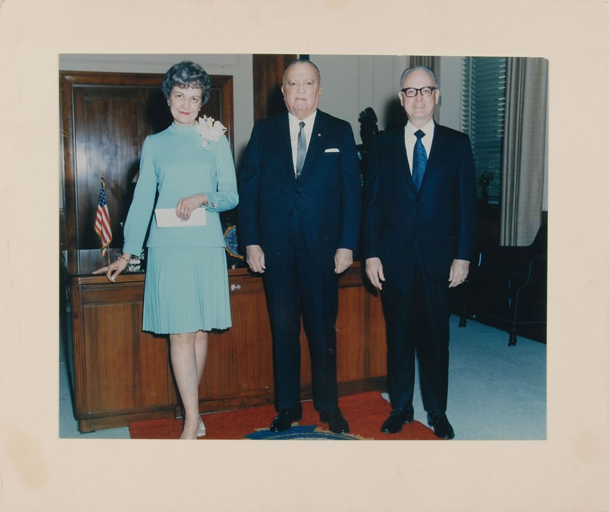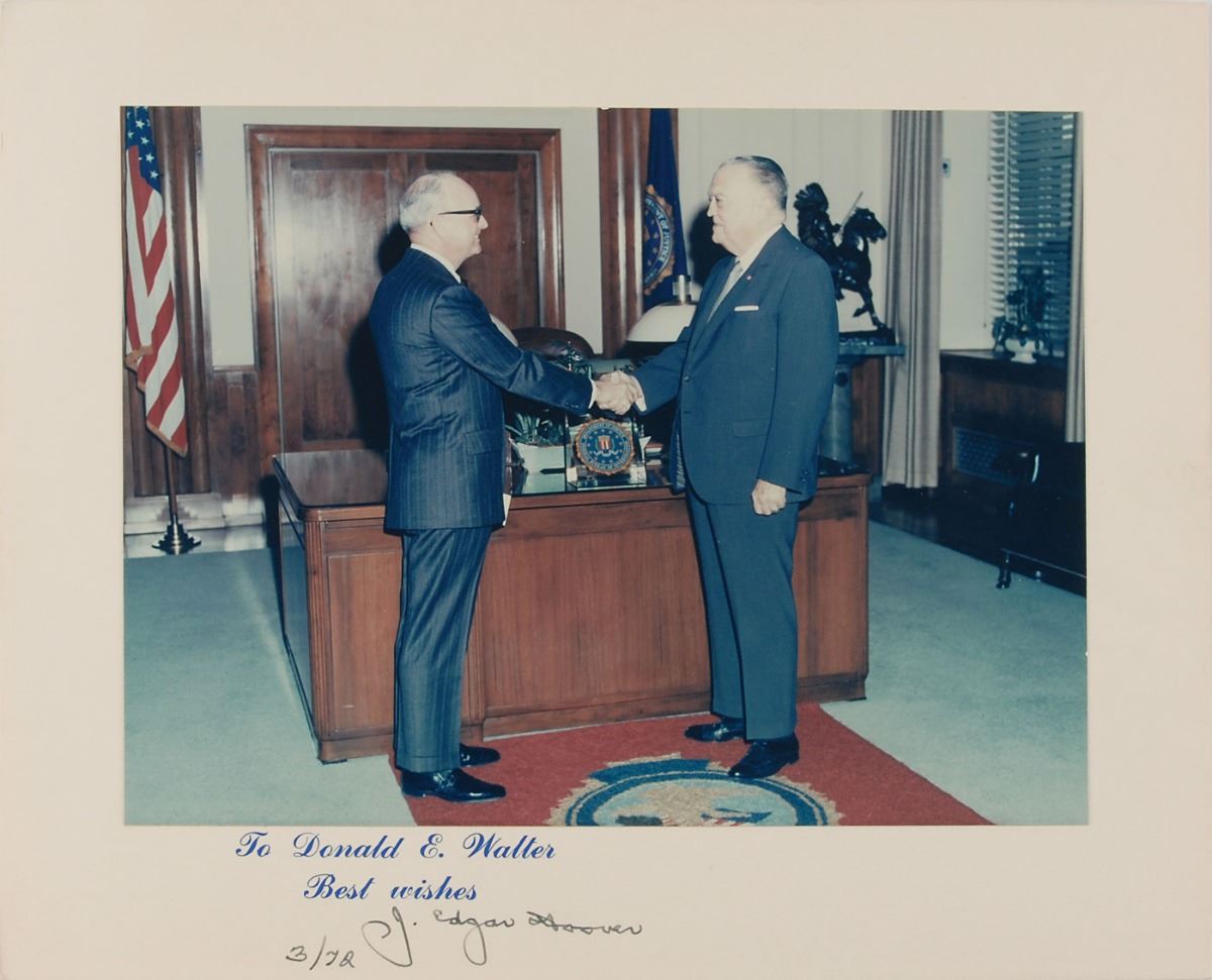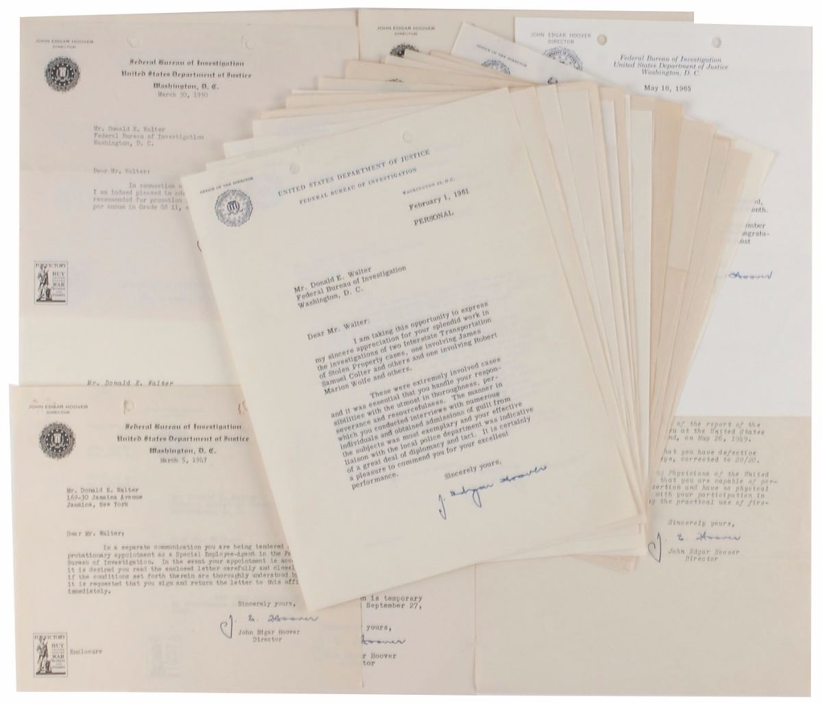 Uncommon collection of 30 TLSs, with 19 signed “J. E. Hoover” and “J. Edgar Hoover,” and 11 bearing preprinted signatures, Federal Bureau of Investigation and United States Department of Justice letterhead, dated between 1947 and 1965. Also includes a color 8.75 x 6.75 photo of Hoover shaking hands with Special Agent Donald E. Walter, affixed to it original mount, signed on the mount in fountain pen, “J. Edgar Hoover, 3/72.” In overall fine condition. Accompanied by an unsigned photo of Hoover posing with Walter and his wife, Louise D. Walter.