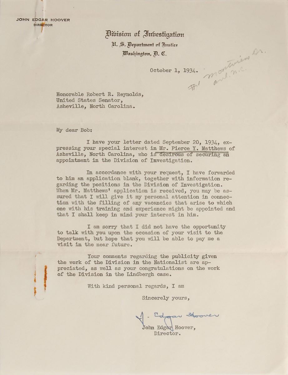 TLS, one page, 8 x 10.5, Division of Investigation letterhead, 1934. Letter to North Carolina Senator Robert Rice Reynolds, in full: “I have your letter dated September 20, 1934, expressing your special interest in Mr. Pierce Y. Matthews of Asheville, North Carolina, who is desirous of securing an appointment in the Division of Investigation. In accordance with your request, I have forwarded to him an application blank, together with information regarding the positions in the Division of Investigation. When Mr. Matthews’ application is received, you may be assured that I will give it my personal attention in connection with the filling of any vacancies that arise to which one with his training and experience might be appointed and that I shall keep in mind your interest in him. I am sorry that I did not have the opportunity to talk with you upon the occasion of your visit to the Department, but hope that you will be able to pay me a visit in the near future. Your comments regarding the publicity given the work of the Division in the Nationalist are appreciated, as well as your congratulations on the work of the Division in the Lindbergh case.” In fine condition, with two old rusty paperclip impressions. Accompanied by the original mailing envelope, and a US Senate reference sheet, signed by Reynolds.