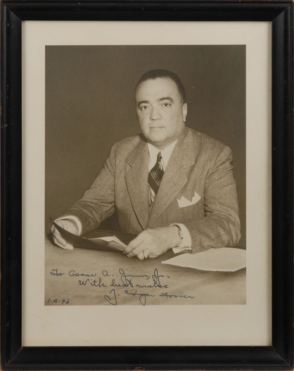 Vintage matte-finish 8.75 x 11 portrait of Hoover at his desk, signed and inscribed in fountain pen, "To Oscar A. Guinn, Jr., With best wishes, J. Edgar Hoover, 1.2.46.” Framed and in fine condition, with a light crease to the lower left corner. Pre-certified PSA/DNA.