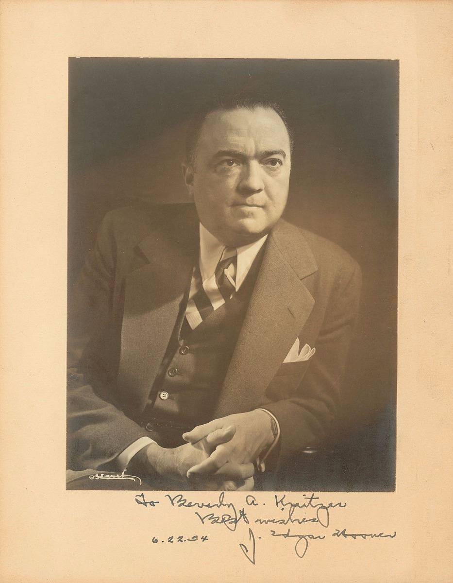 Vintage matte-finish 6.5 x 8.5 portrait of Hoover, affixed to its original 9 x 11.5 mount, signed and inscribed on the mount in fountain pen, “To Beverly A. Knitzer, Best wishes, J. Edgar Hoover,” who adds the date, “6.22.54.” In fine condition, with slight creasing and silvering to the photo, and some creasing to corners of the mount.