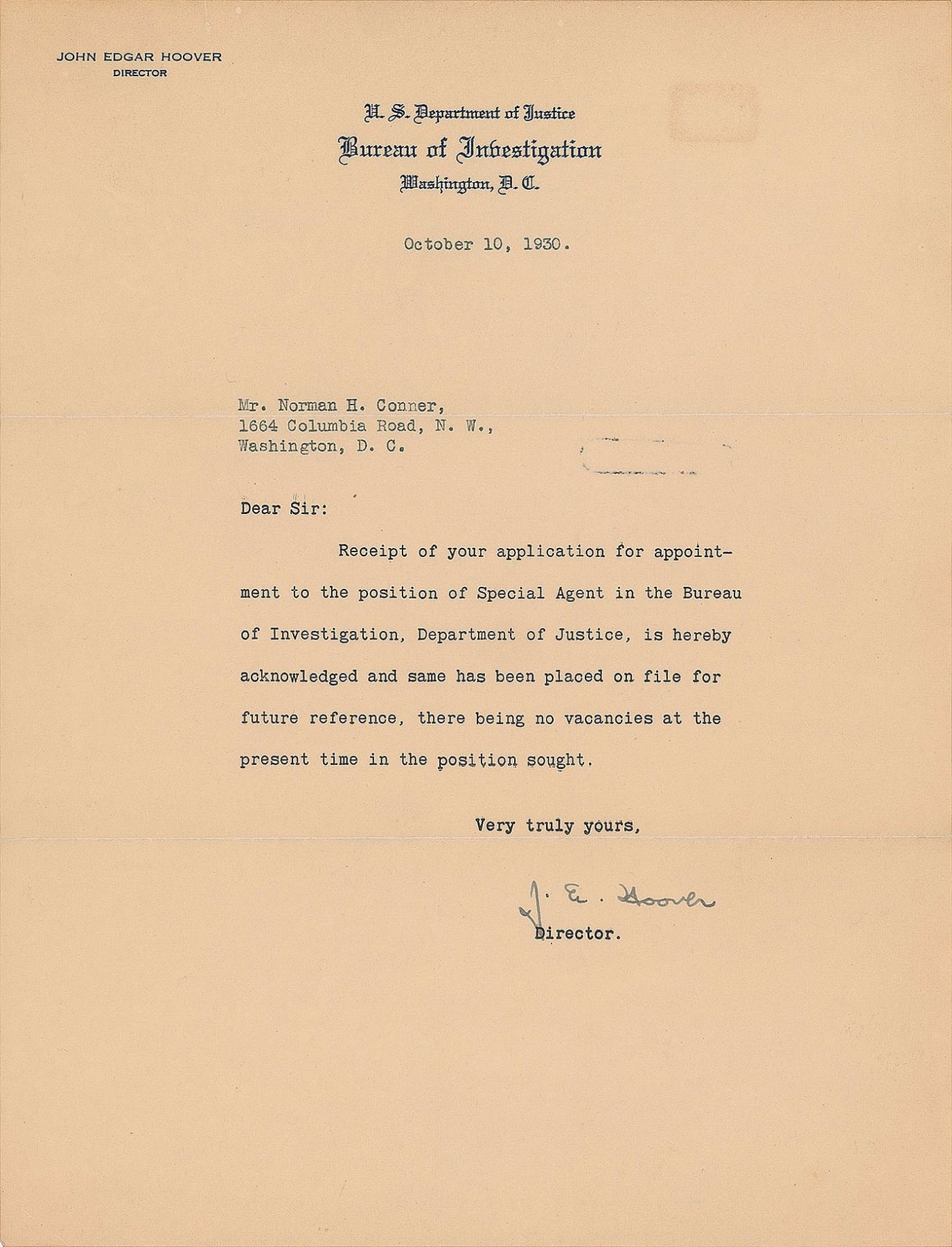 TLS signed “J. E. Hoover,” one page, 8 x 10.5, US Department of Justice, Bureau of Investigation letterhead, October 10, 1930. Letter to Norman H. Conner, in full: "Receipt of your application for appointment to the position of Special Agent in the Bureau of Investigation, Department of Justice, is hereby acknowledged and same has been placed on file for future reference, there being no vacancies at the present time in the position sought." Includes a TLS from Inspector J. M. Keith, dated October 14, 1930, relating to the completion of Conner's application. In fine condition. Also accompanied by the original mailing envelope, and a blank Department of Justice application for appointment. A sought-after pre-FBI letter from the Bureau of Investigation director.