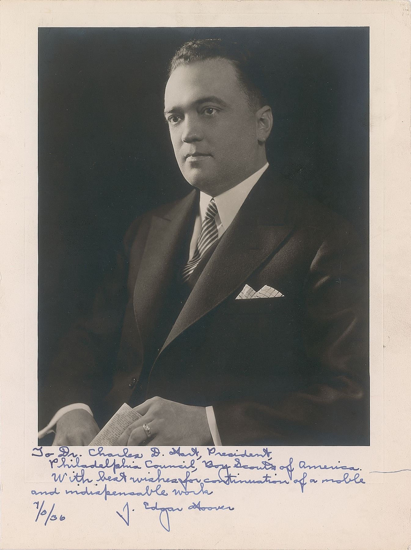 Vintage matte-finish 8.5 x 11 half-length portrait of Hoover in a handsome and youthful pose, signed and inscribed in fountain pen, "To Dr. Charles D. Hart, President, Philadelphia Council, Boy Scouts of America. With best wishes for continuation of a noble and indispensable work, J. Edgar Hoover, 7/3/36.” In fine condition, with trimmed borders.