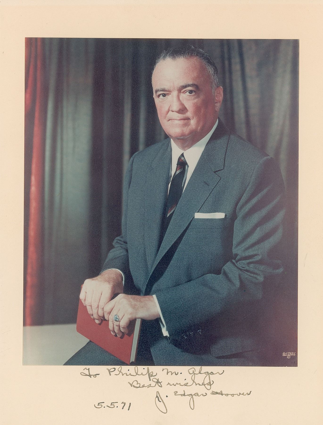 Color satin-finish 6.75 x 8 half-length portrait of Hoover by Autrey of Hollywood, affixed to the original mount, signed and inscribed on the mount in black ink, "To Philip M. Algar, Best wishes, J. Edgar Hoover, 5.5.71.” In very fine condition.