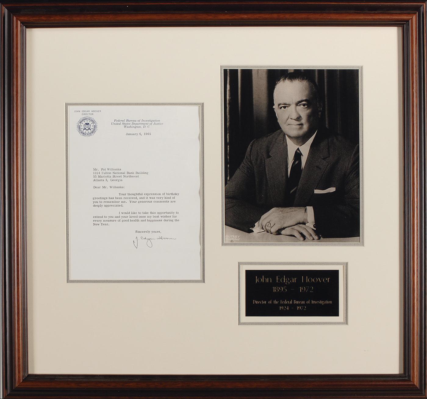 TLS, one page, 7 x 9.25, FBI letterhead, January 6, 1965. Letter of thanks for birthday wishes. In part: “Your thoughtful expression of birthday greetings has been received, and it was very kind of you to remember me. Your generous comments are deeply appreciated.” Double matted and framed, with a portrait of Hoover and a small plaque, to an overall size of 23 x 21.5. In fine condition. Oversized.