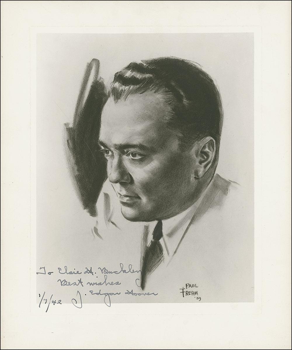 Vintage 9.25 x 11.25 print of Hoover by Paul Frehm, signed and inscribed in fountain pen, “To Claire H. Buckley, Best wishes, J. Edgar Hoover 1/7/42.” In fine condition, with slight upper left corner bend and light uniform toning at the extreme edges.