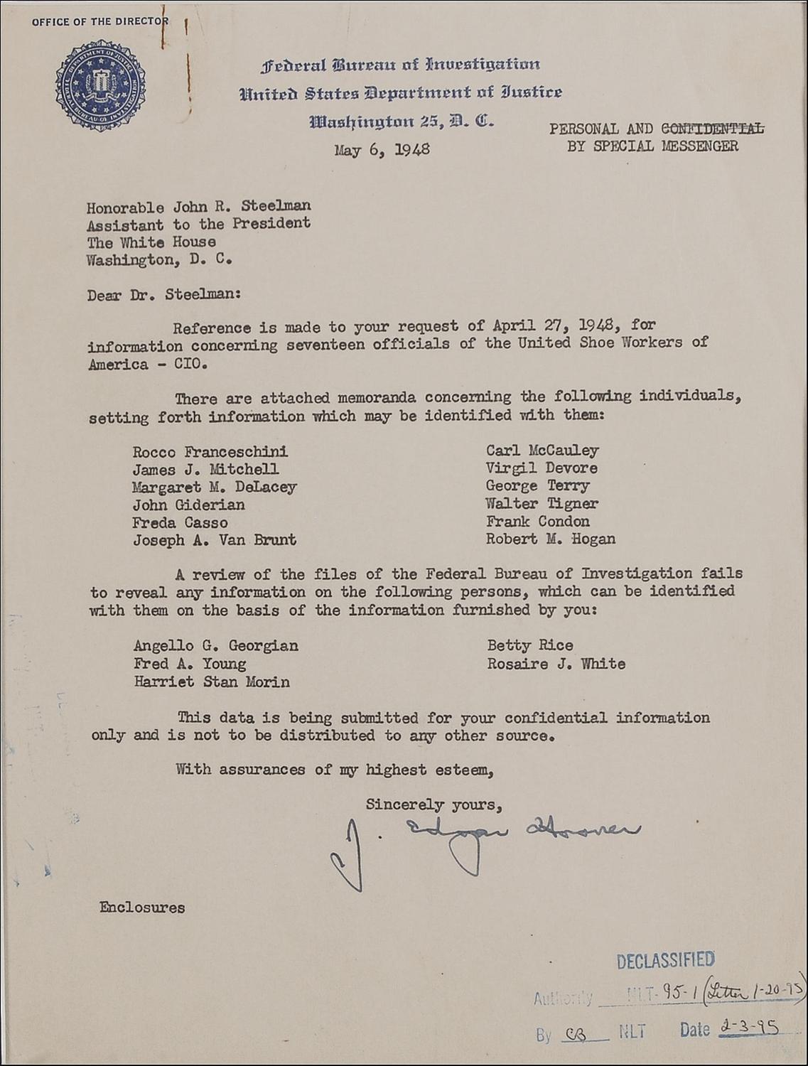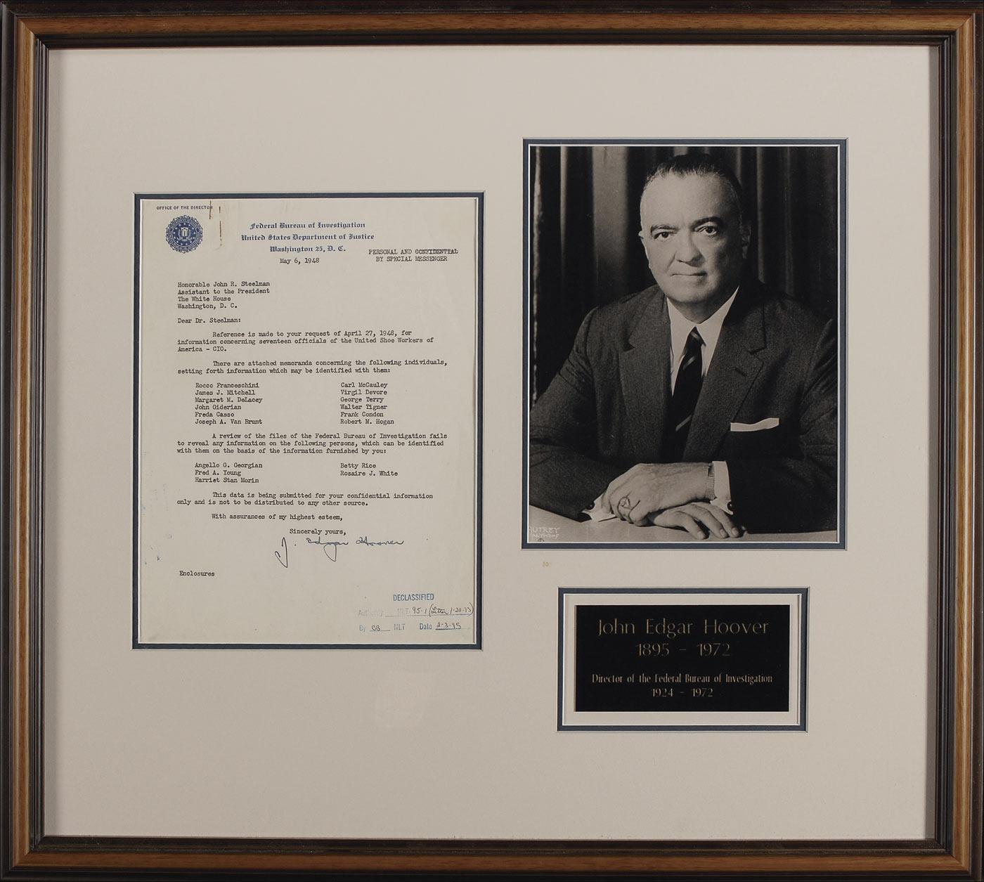 TLS, one page, 8.5 x 11, FBI letterhead, May 6, 1948. Confidential letter to John R. Steelman, assistant to the president, at the White House in which Hoover forwards information. In part: “Reference is made to your request…for information concerning seventeen officials of the United Shoe Workers of America…there are attached memoranda concerning the following individuals, setting forth information which may be identified with them.” The letter lists twelve names, with no information being found on the remaining five. Letter concludes: “This data is being submitted for your confidential information only and is not to be distributed to any other source.” Double matted and framed, with a portrait of Hoover and a small plaque, to an overall size of 23 x 21.5. Rusty paperclip mark to top edge, a few creases, show-through from stamp on reverse, and a declassified stamp to bottom of page, otherwise fine condition. An interesting example of Hoover possibly exceeding his jurisdiction as FBI Director during the ‘Red Scare’ in America. Accompanied by 11 one page brief reports on various members of the organization, including three with direct ties to the Communist Party. Oversized.