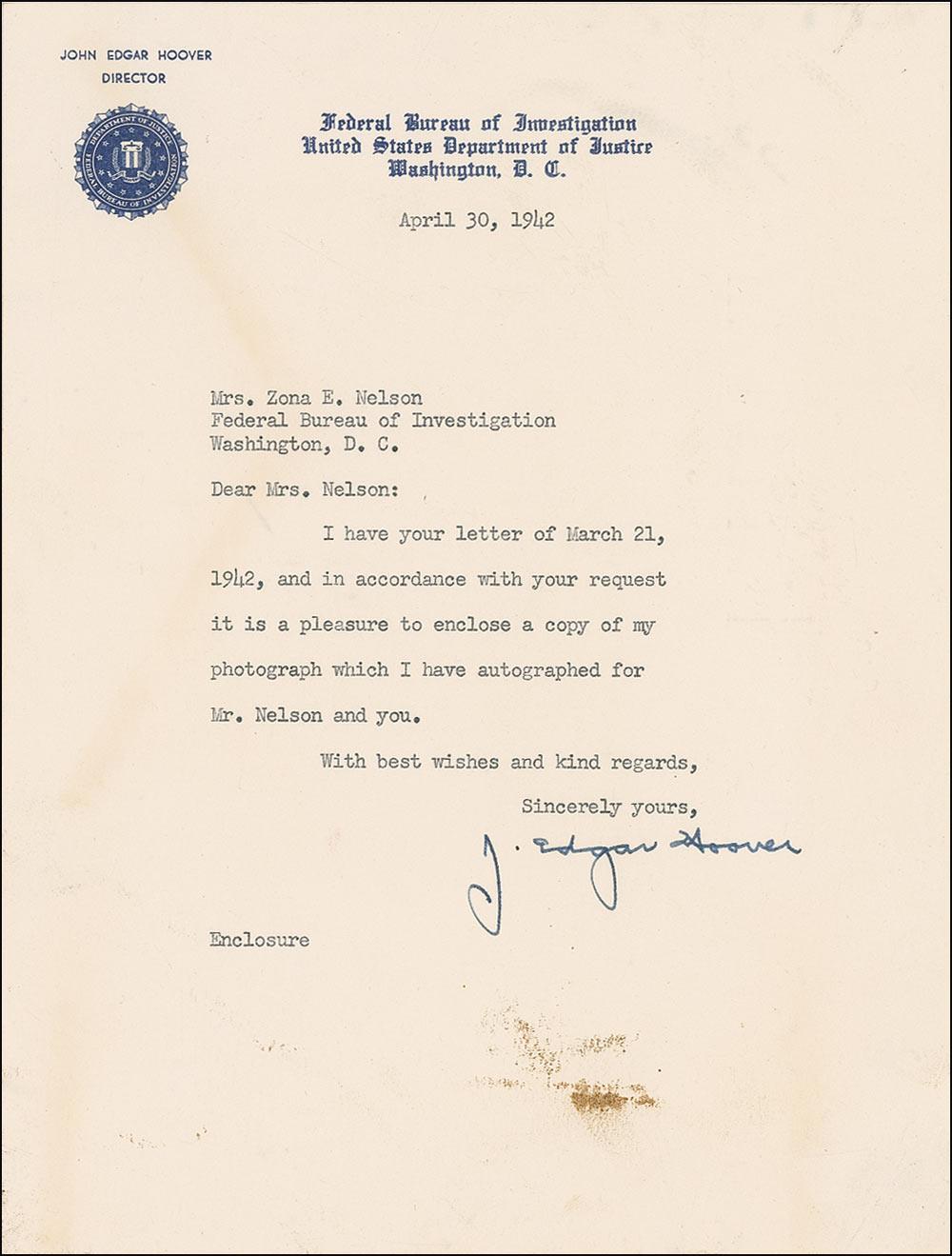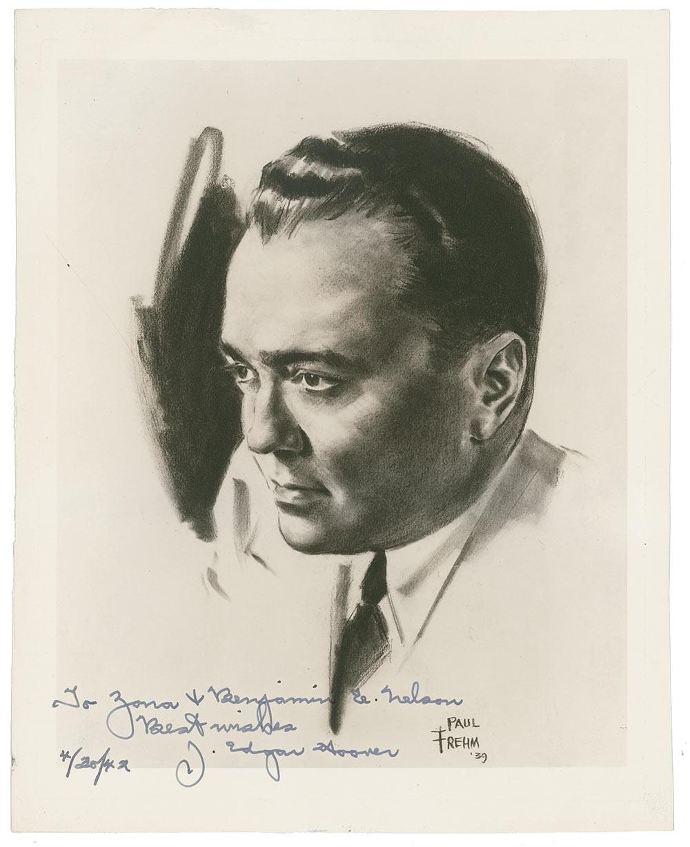Nice 8 x 10 print of an artist’s portrait of Hoover, signed and inscribed in fountain pen, “To Zona & Benjamin E. Nelson, Best wishes, J. Edgar Hoover 4/30/42”; and a one page TLS, signed “J. Edgar Hoover,” acknowledging the signed print. In fine condition, with several areas of toning to letter.