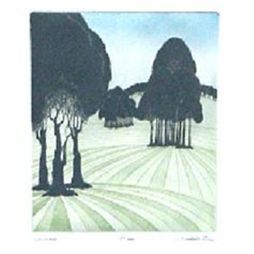 A striking piece. The trees fade away into a landscape almost sureal. The overall size is 20.5 x 18, image is 7w x 8h. Signed in pencil and numbered 134 of 200.