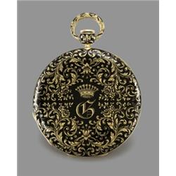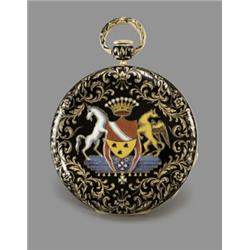 GILT CYLINDER MOVEMENT, PLAIN THREE-ARM BALANCE, BIMETALLIC COMPENSATION CURB AND PARACHUTE SHOCK-RESIST SYSTEM, POLISHED STEEL HAMMERS, PLUNGE QUARTER-TURN REPEAT, GOLD CUVETTE, SILVERED ENGINE-TURNED DIAL, SATIN-FINISHED CHAPTER RING, BLACK ROMAN NUMERALS, THE CASE, BAND, BOW AND PENDANT OVERALL WITH FLORAL MOTIFS HEIGHTENED WITH BLACK ENAMEL, THE BACK CENTERED BY INITIALS, THE FRONT CENTERED BY VARI-COLOR COAT-OF-ARMS