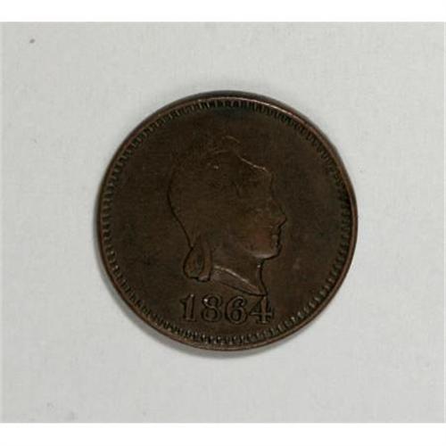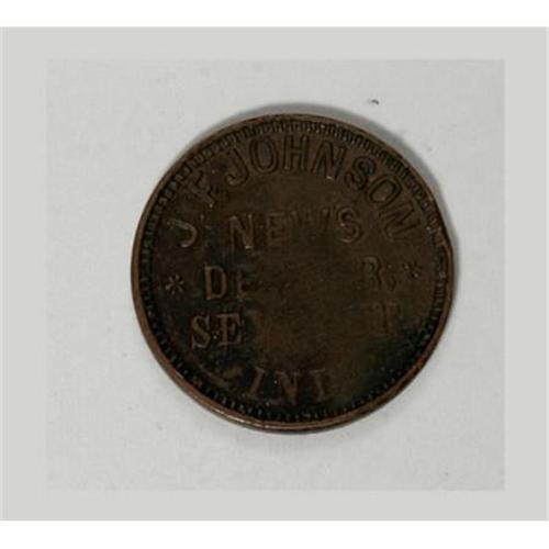 <B>J.F. Johnson Civil War Merchant Token.</B></I> Scarce Civil War merchant token issued by J.F. Johnson of Seymour, Indiana, <B>Fuld-IN830A-1a, R.8</B></I>. The reverse is very weakly struck, and as a result some lettering is missing.<BR><BR><b>Shipping:</b> Coins & Currency (<a target="_blank" href="http://www.heritageauctions.com/common/shipping.php">view shipping information</a>)