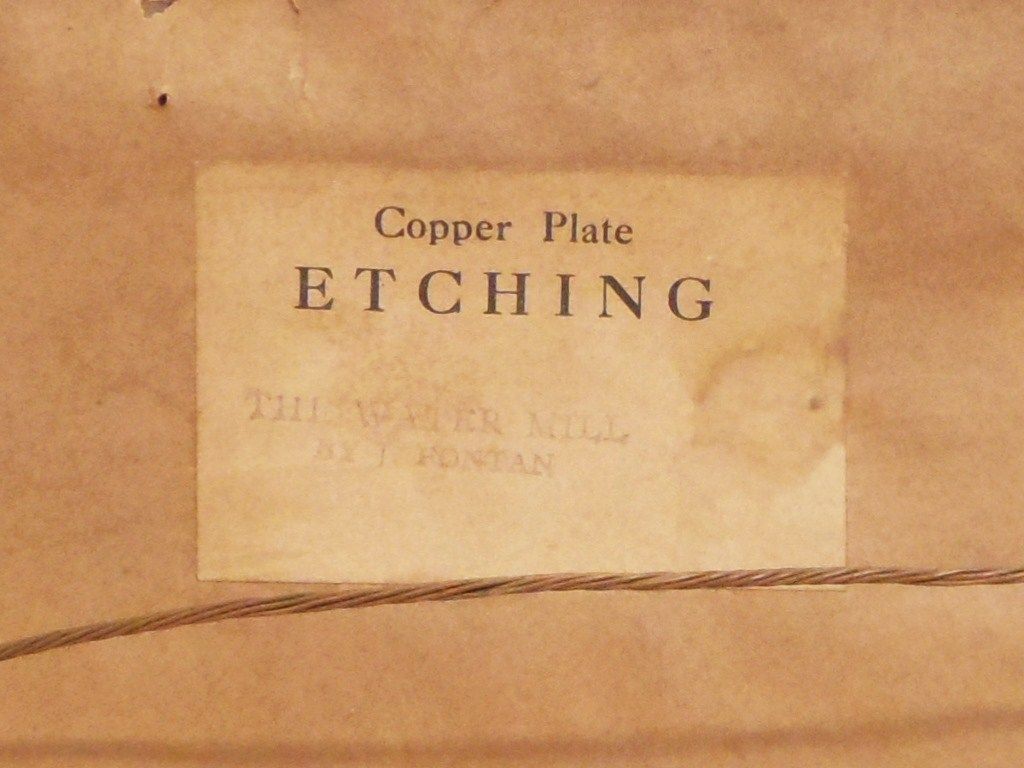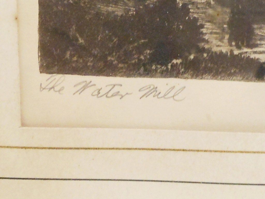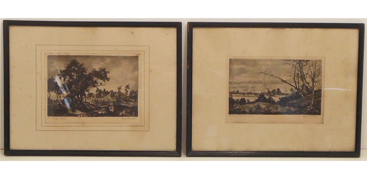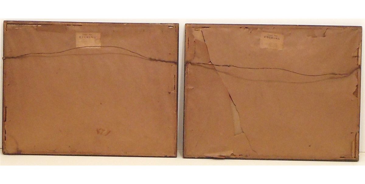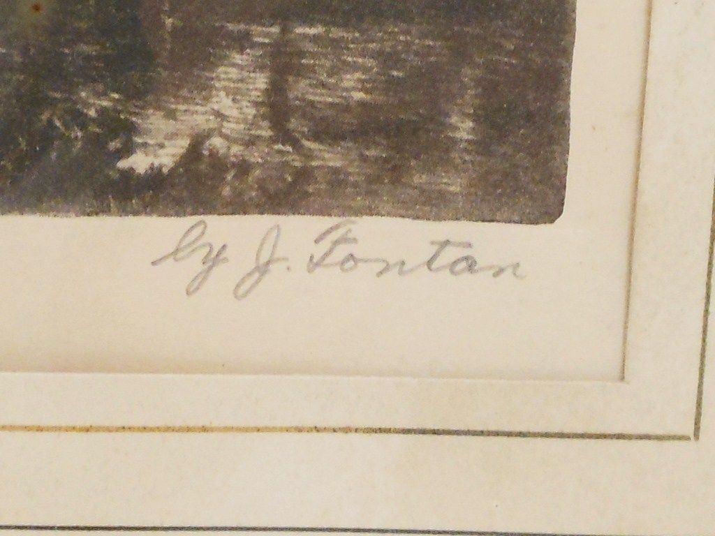 Two 6" x 9" matted in a 13" x 17" frame, Joseph Augustin Fontan (French 19th century artist). Copper plate etchings signed and titled: "Fork of Ville D'avone" and "The Water Mill". Circa 1880's. Both are in good condition, matting has foxing and smudges, frames have loss.