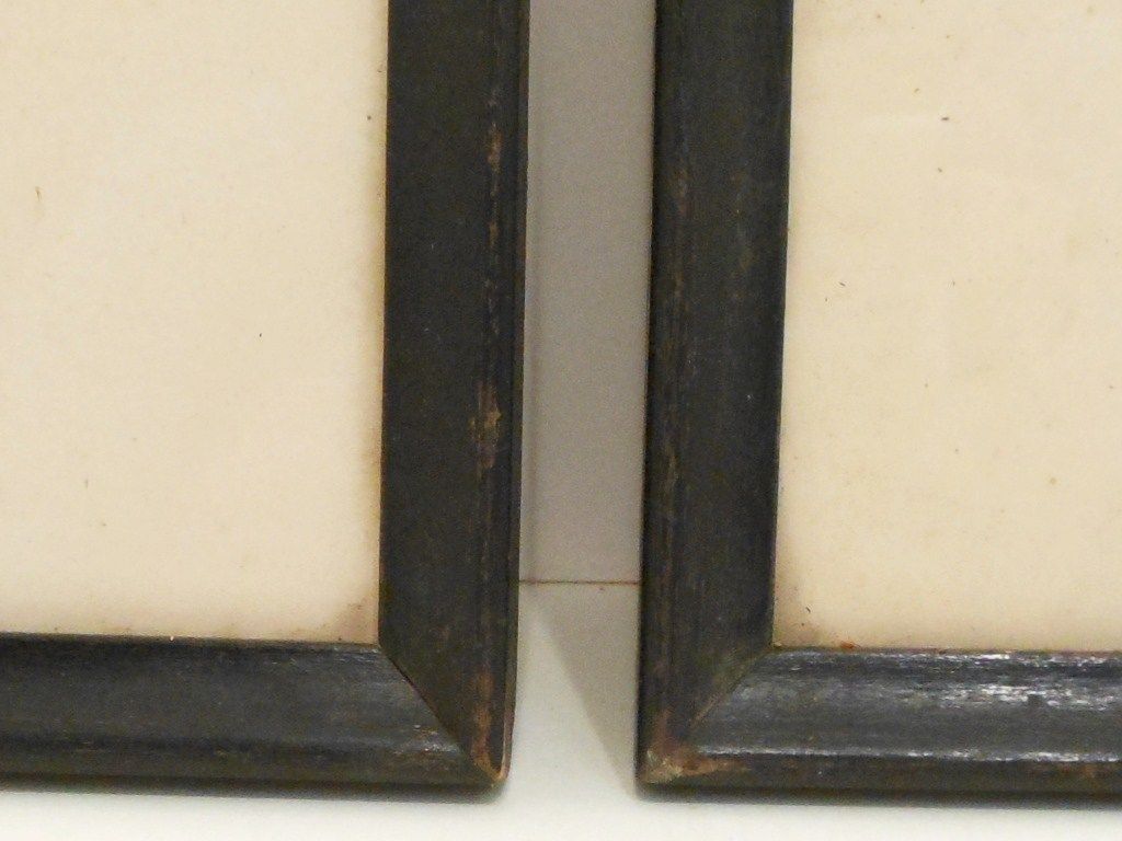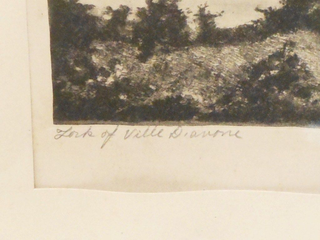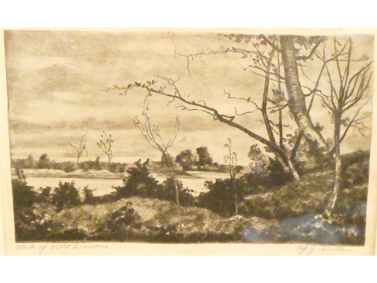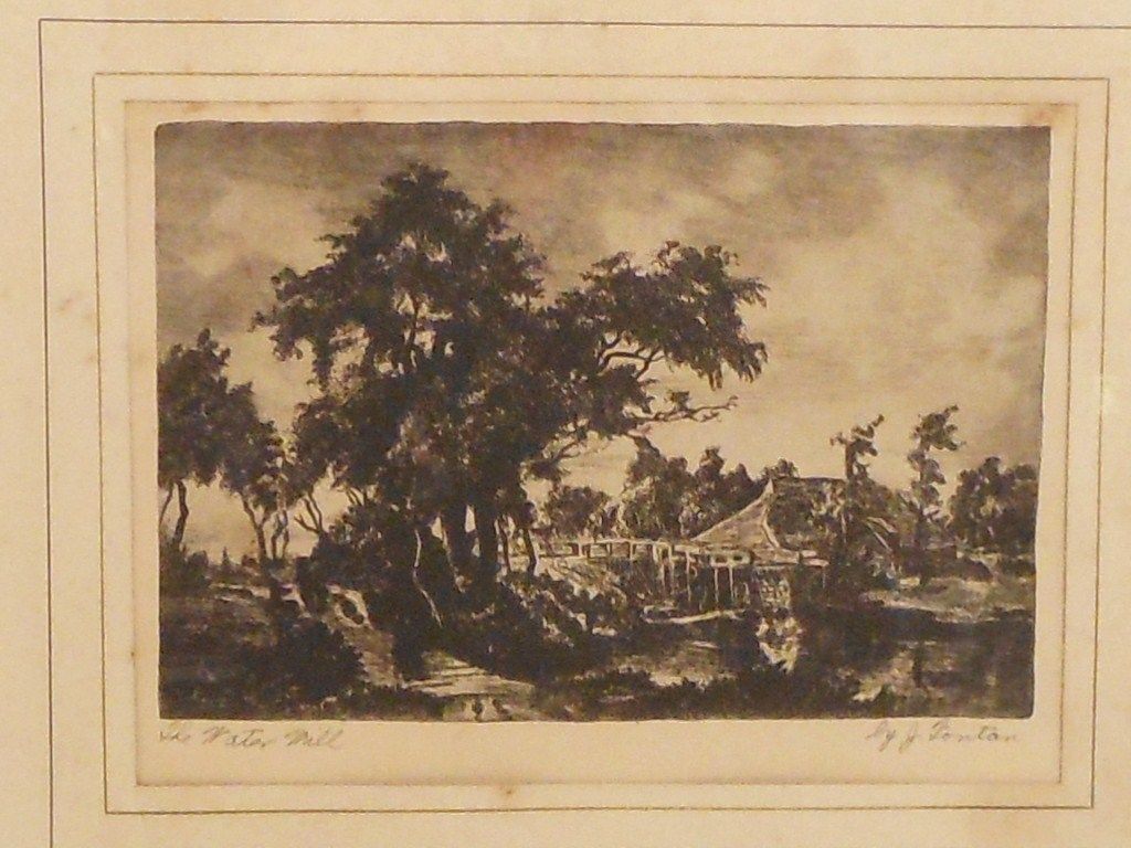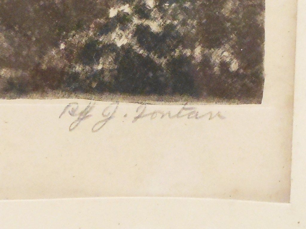 Two 6" x 9" matted in a 13" x 17" frame, Joseph Augustin Fontan (French 19th century artist). Copper plate etchings signed and titled: "Fork of Ville D'avone" and "The Water Mill". Circa 1880's. Both are in good condition, matting has foxing and smudges, frames have loss.