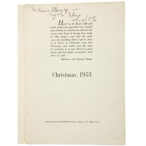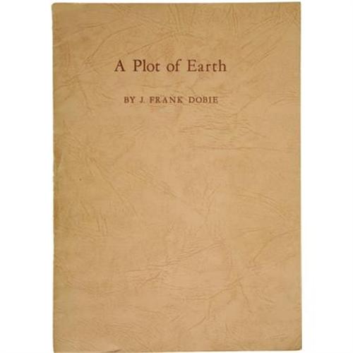 <B>J. Frank Dobie: Inscribed Copy of Dobie's Autobiographical Sketch: <I>A Plot of Earth.</B></I></B></I> <BR>eprinted from Southwest Review, Spring, 1953, Dallas, Texas. . Pamphlet, large octavo (10” x 7”). Printed leather-grained paper wrappers. Inscribed by Dobie to Lewis Ketring, Jr., and with a copy of a letter from Dobie to Ketring laid in. Ketring's ink ownership stamp on inside of front wrapper. Minor bumping and soiling, else very good.<BR><BR><b>Shipping:</b> Books & Catalogs (<a target="_blank" href="http://www.heritageauctions.com/common/shipping.php">view shipping information</a>)