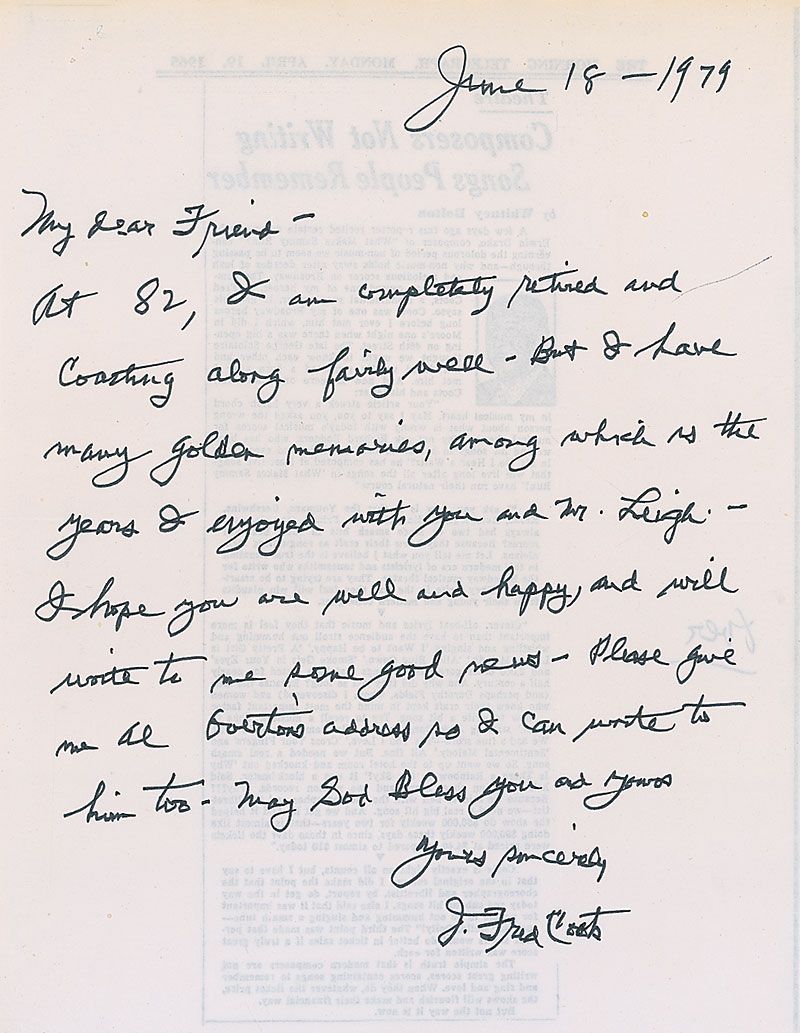 Prolific American songwriter (1897–1985) best known for his durable Christmas classic ‘Santa Claus Is Coming to Town.’ ALS, one page, 8.5 x 11, June 18, 1979. Letter to an old friend, written on the reverse of a photocopied article about Coots from the April 19, 1965, issue of The Morning Telegraph. In part, “I am completely retired and coasting along fairly well—But I have many golden memories.” In fine condition, with a staple hole to top left and intersecting folds.