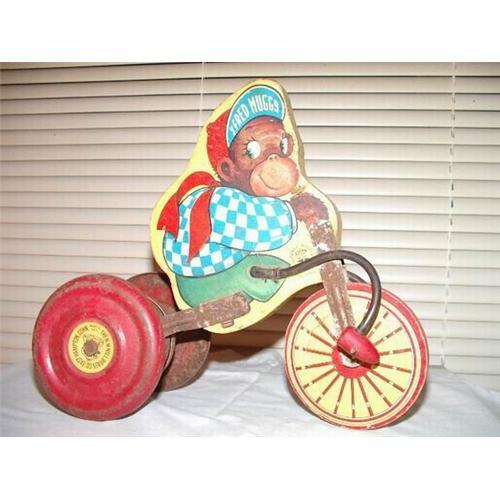 J. Fred Muggs was the monkey on The Today Show on NBC in the mid 1950's. This pull toy has Muggs on his tricycle and when he pedals, bells ring. Marked 1955, The N. N. Hill Brass Company, Hampton, Conn. U.S.A. Unusual piece in good condition for it's age.