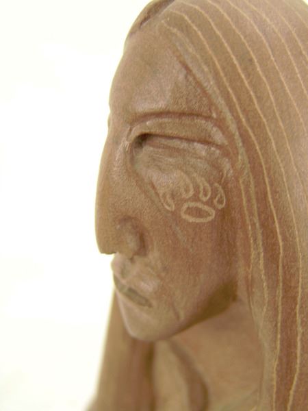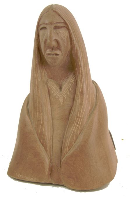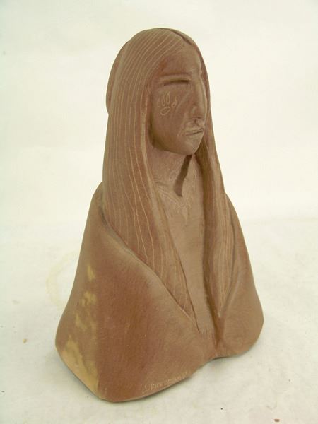 Ca. 1978, Signed original carved red stone sculpture of a robed Indian. Very good condition. 11-1/2" x 7" x 5"