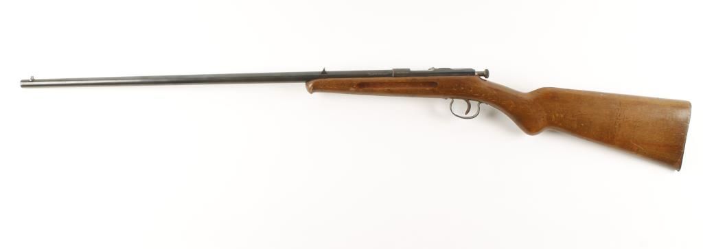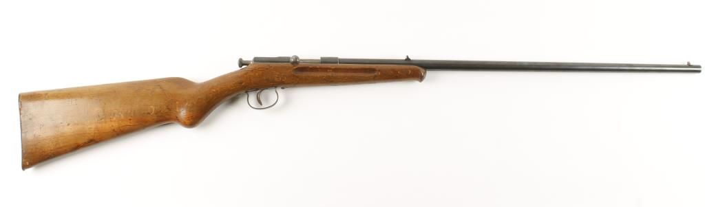 Early single shot bolt action rifle with 23" barrel. Blued finish, plain pistol grip wood stock with Schnabel forend and finger grooves on each side of stock and fixed sights. Good action and bore has an obstruction in it. Condition: Good overall showing use. *Curio & Relic Firearm*