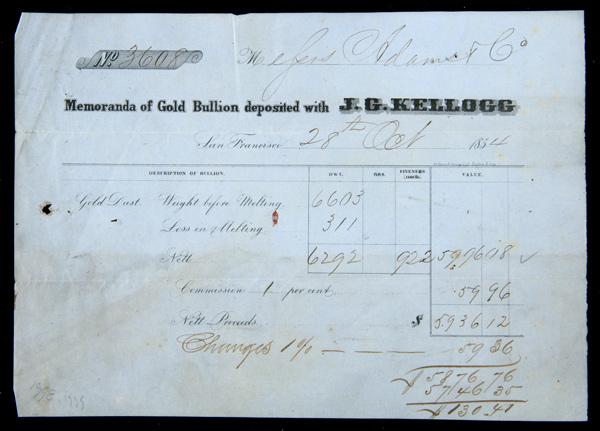 No. 3608 Memoranda of Gold Bullion deposited with J.G. Kellogg by Adams & Co. This receipt measures 8 3/8x5" and was printed with black on thin light blue paper by La Count & Strong. Lithographer is Britton & Rey. Other than the differance of the assayers names, this receipt was printed using the exact same layout as the earlier dated Kellogg & Richter receipts listed. Weight above melting 6603 dwt, loss in melting 311 dwt, Nett 6292 dwt, Fineness .922. Net proceeds $5,936.12 less 1% Commission and costs. Typical folds and foxing and there are several small staple holes and a larger hole near the left side. Not signed--- however included is a second and much smaller piece of paper referencing assay #3608 to G.M. Davidson, Marysville. R8. From the John J. Ford, Jr. Collection.