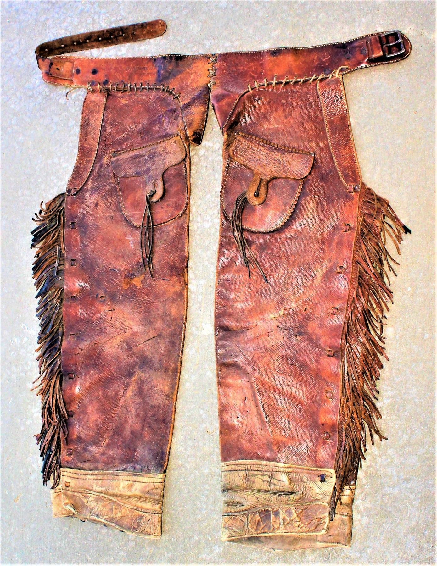 Early fringed shotgun chaps from a historical maker, with great cowboy character and style.